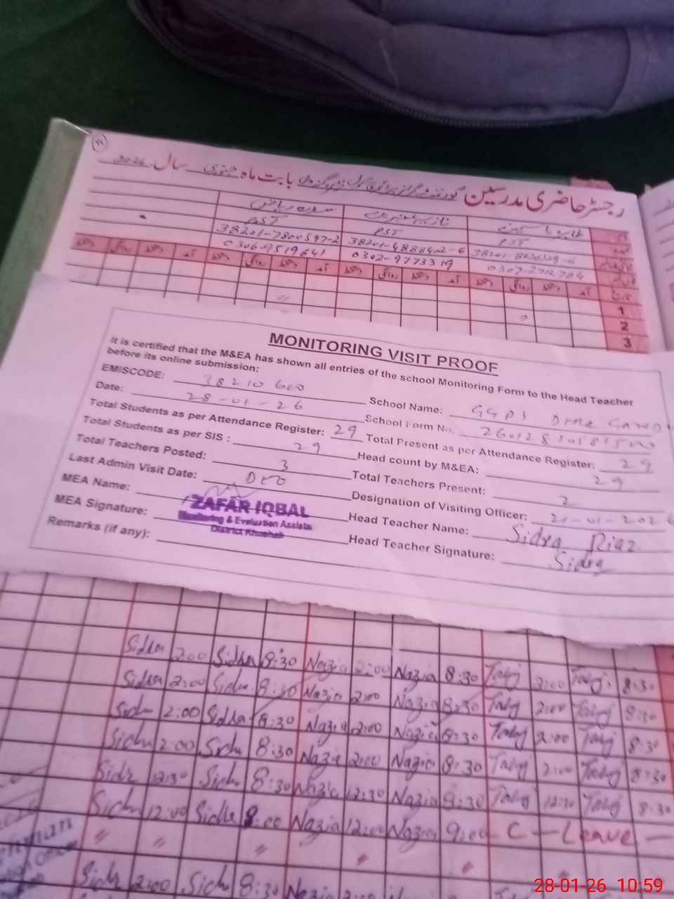 | Attendance Register | Head Teacher | MEA with School | Visit Proof |