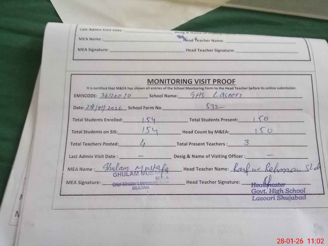 | Attendance Register | Head Teacher | MEA with School | Visit Proof |