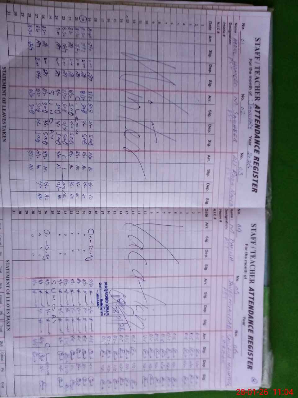 | CNIC | Full Name | Designation | R/C | Absence During Last Calender Month |
