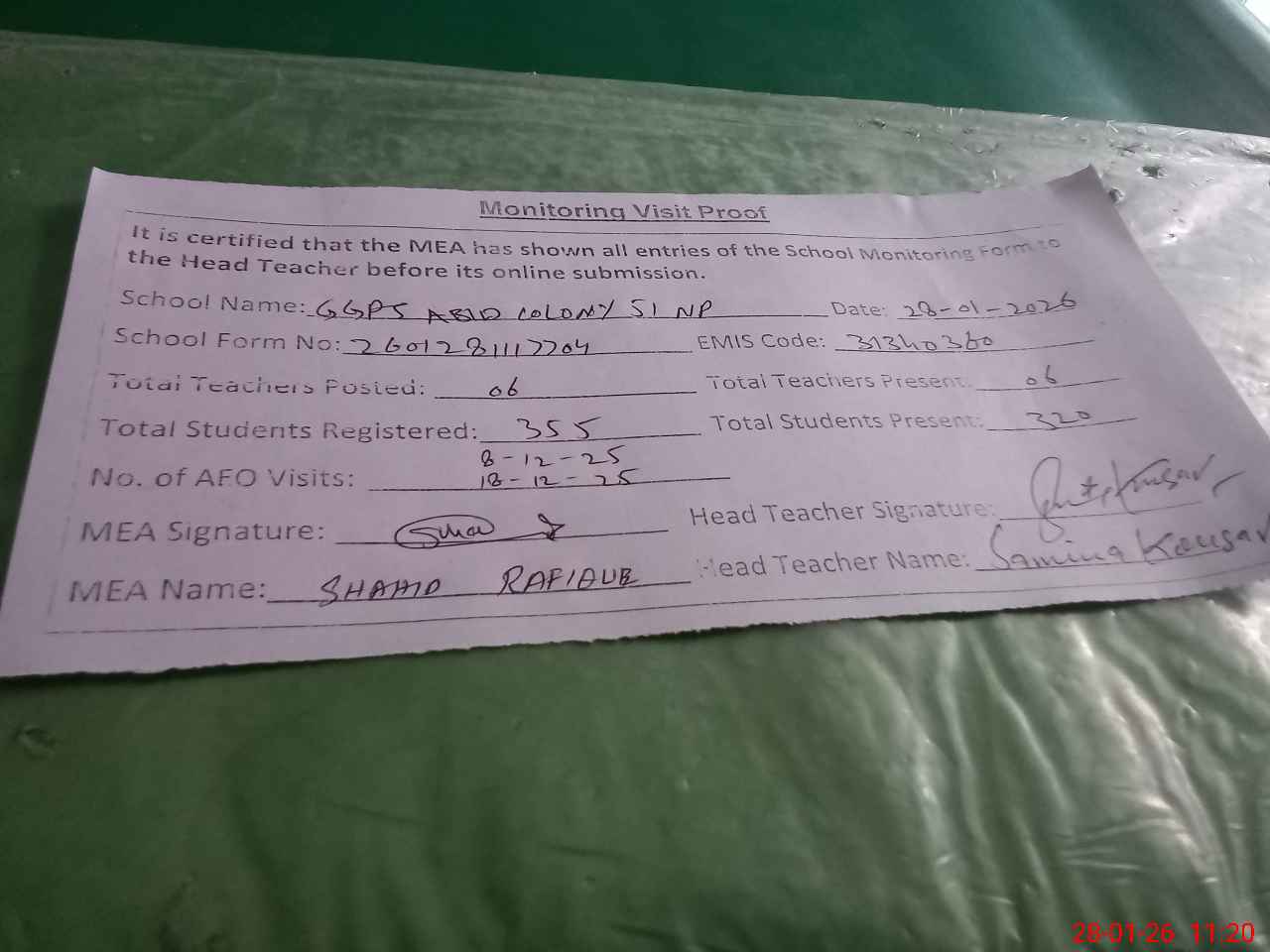| Attendance Register | Head Teacher | MEA with School | Visit Proof |