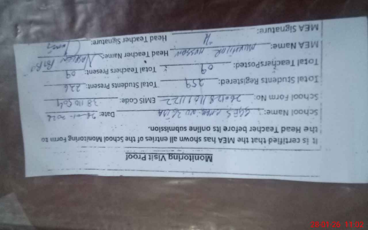 | Attendance Register | Head Teacher | MEA with School | Visit Proof |