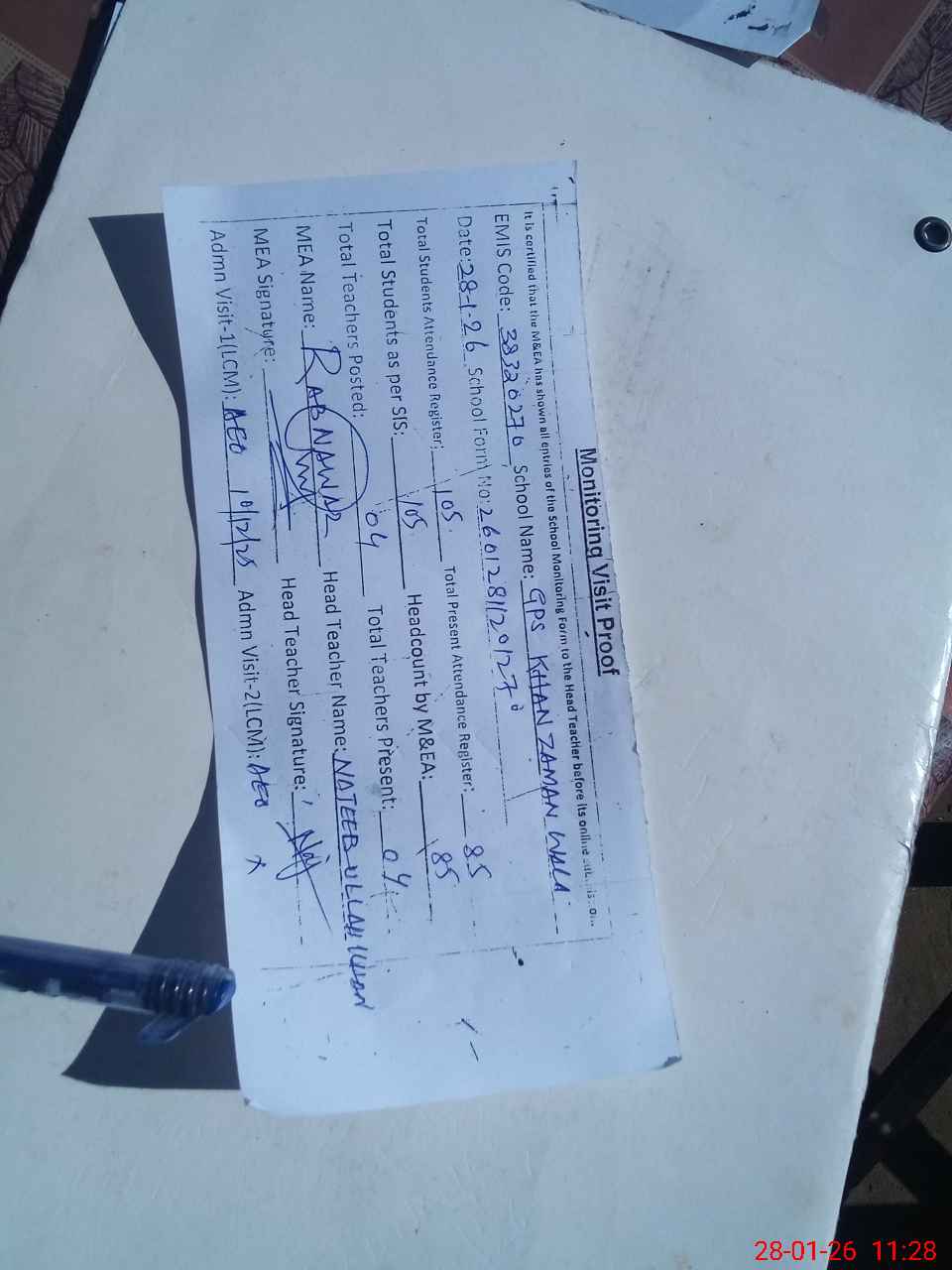 | Attendance Register | Head Teacher | MEA with School | Visit Proof |