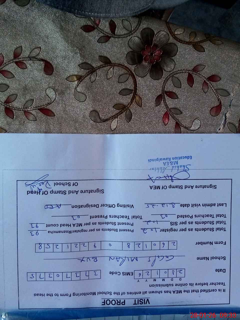 | Certified that this School was Inspected by the Undersigned MEA/DMO Today and the Information Stated Above is as Per Record. | |||||