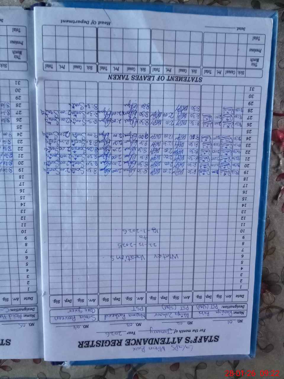 | Leave | Duty | Absent | Maternity | Medical | Ex- Pak |