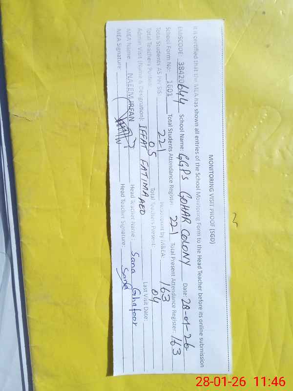 | EMIS Code: 38420644 | Name of School: GGPS JOHAR COLONY SARGODHA | |||