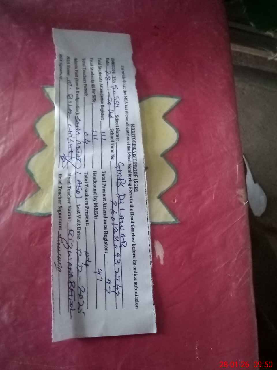 | Attendance Register | Head Teacher | MEA with School | Visit Proof |