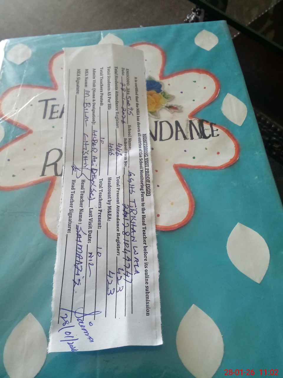 | Attendance Register | Head Teacher | MEA with School | Visit Proof |