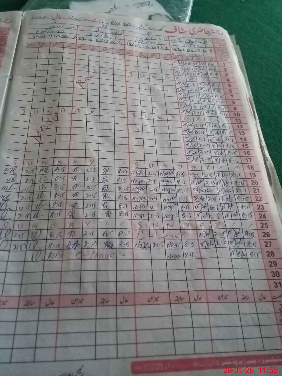 | CNIC | Full Name | Designation | R/C | Absence During Last Calender Month |