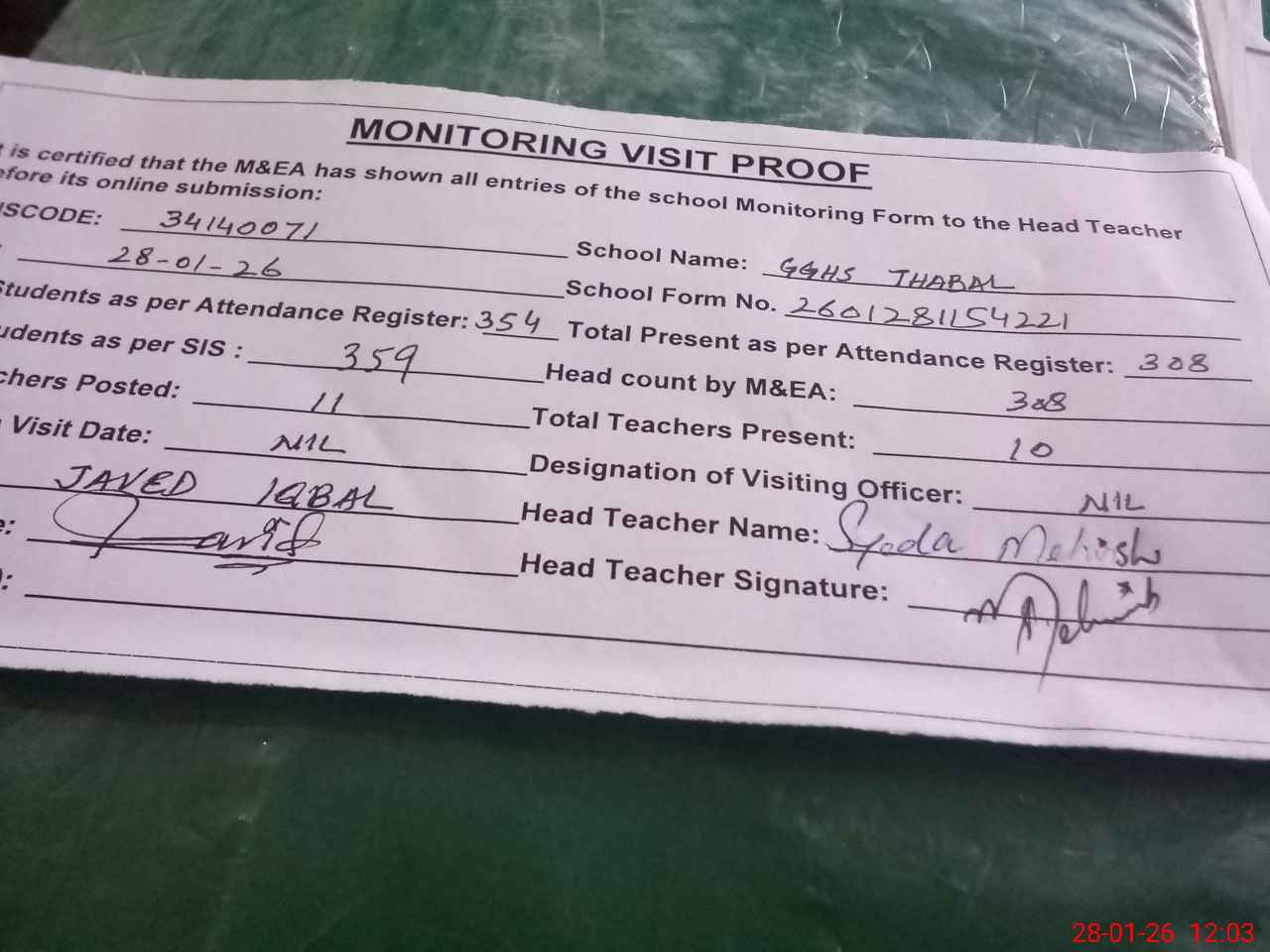 | Attendance Register | Head Teacher | MEA with School | Visit Proof |