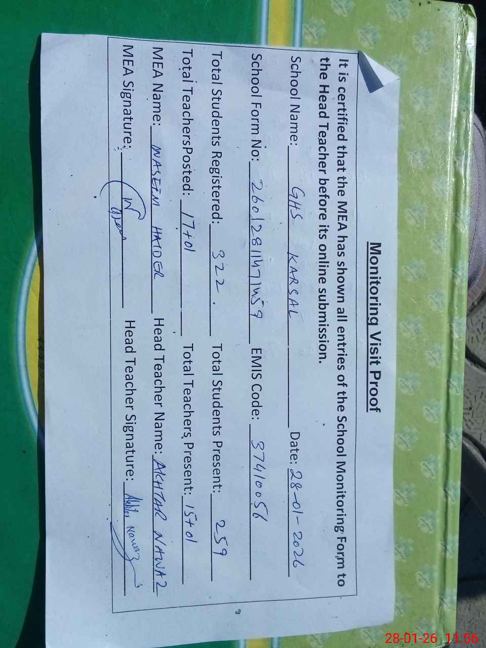 | Attendance Register | Head Teacher | MEA with School | Visit Proof |