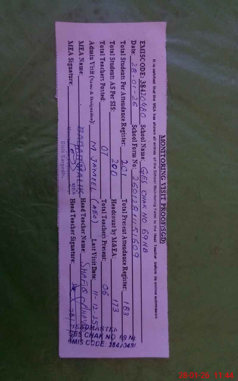 | EMIS Code: 38420480 | Name of School: GES CHAK NO.69 NB | |||