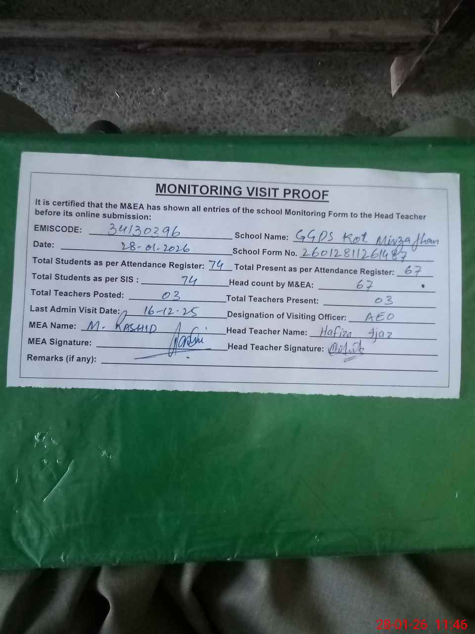 | Attendance Register | Head Teacher | MEA with School | Visit Proof |