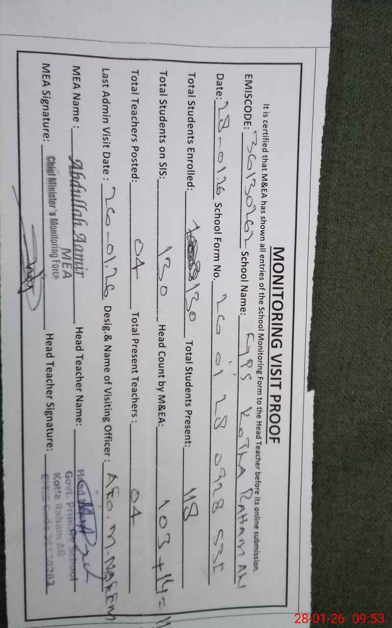 | EMIS Code: 36130262 | Name of School: GPS KOTLA RAHAM ALI LAR MULTAN | |||