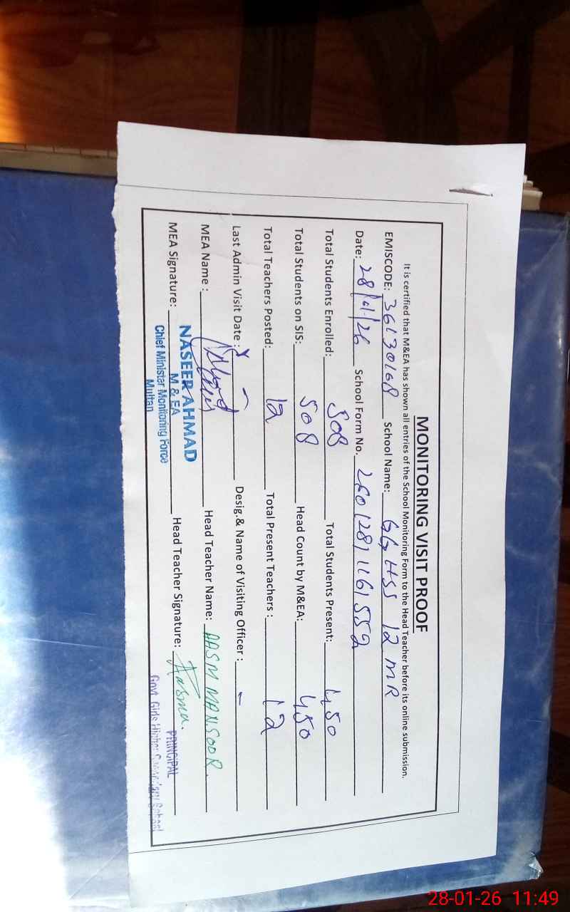 | EMIS Code: 36130108 | Name of School: GGHSS CHAK NO. 12-MR SADDAR MULTAN | |||