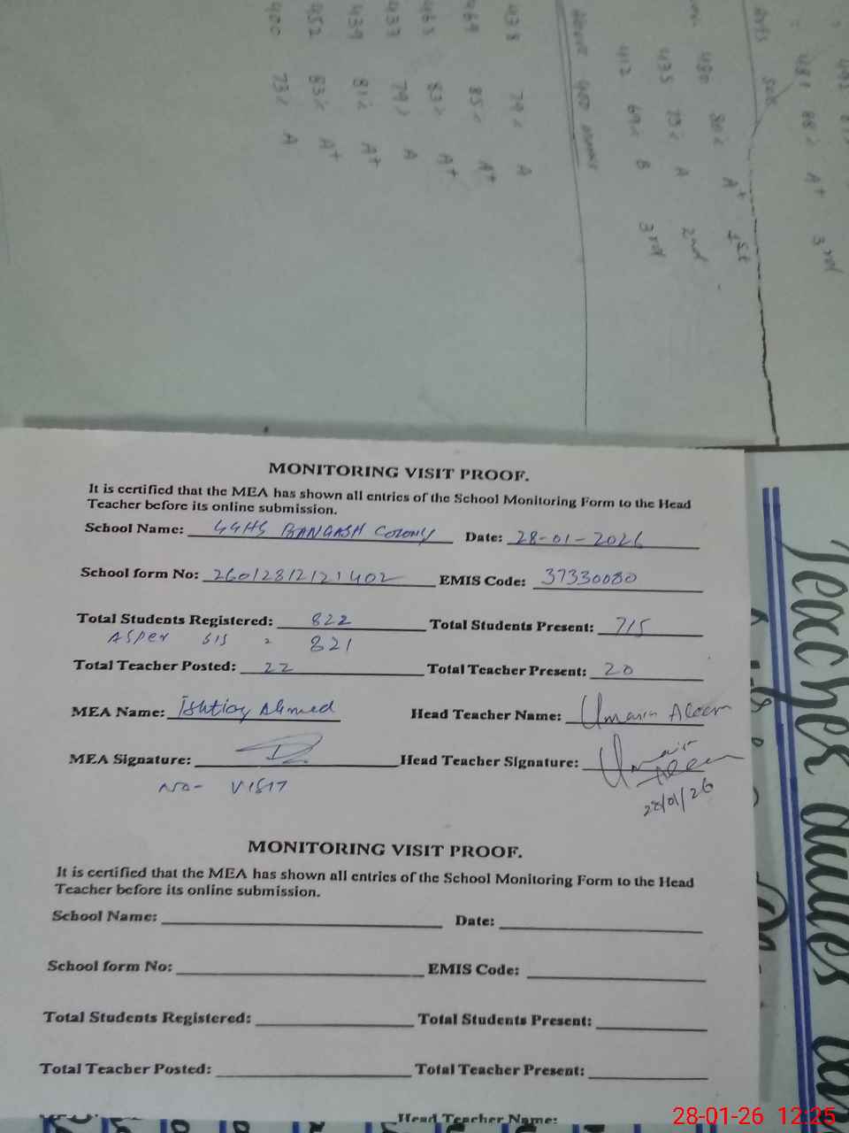 | Attendance Register | Head Teacher | MEA with School | Visit Proof |