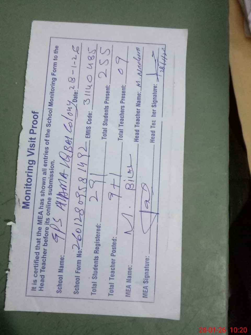| EMIS Code: 31140485 | Name of School: GPS ALLAMA IQBAL COLONY | |||