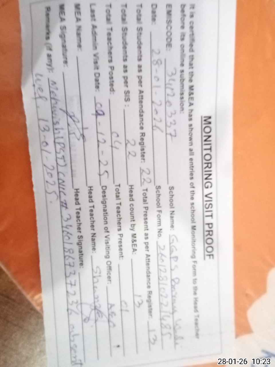 | Attendance Register | Head Teacher | MEA with School | Visit Proof |
