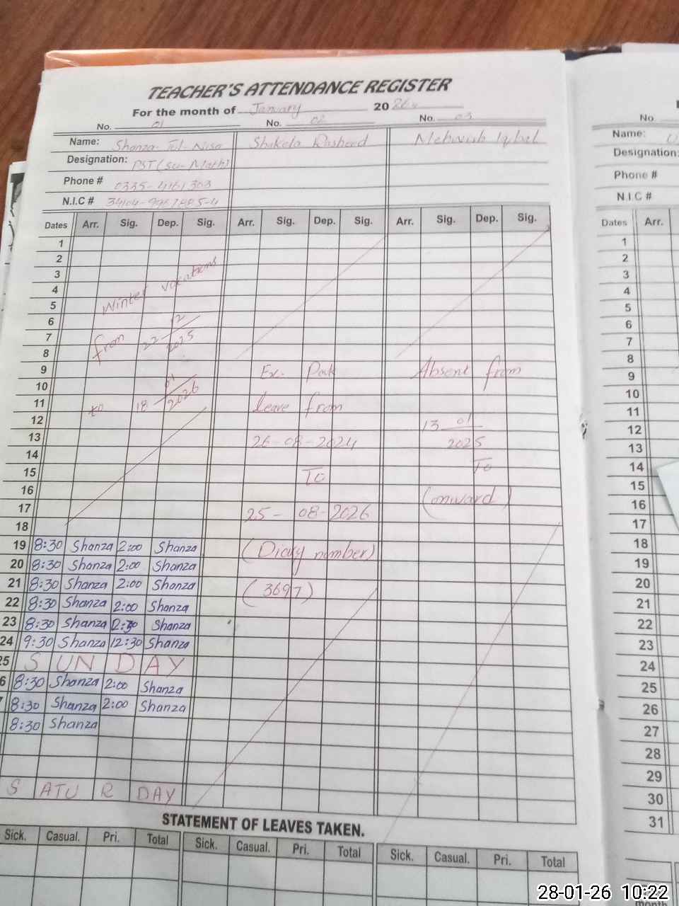 | CNIC | Full Name | Designation | R/C | Absence During Last Calender Month |