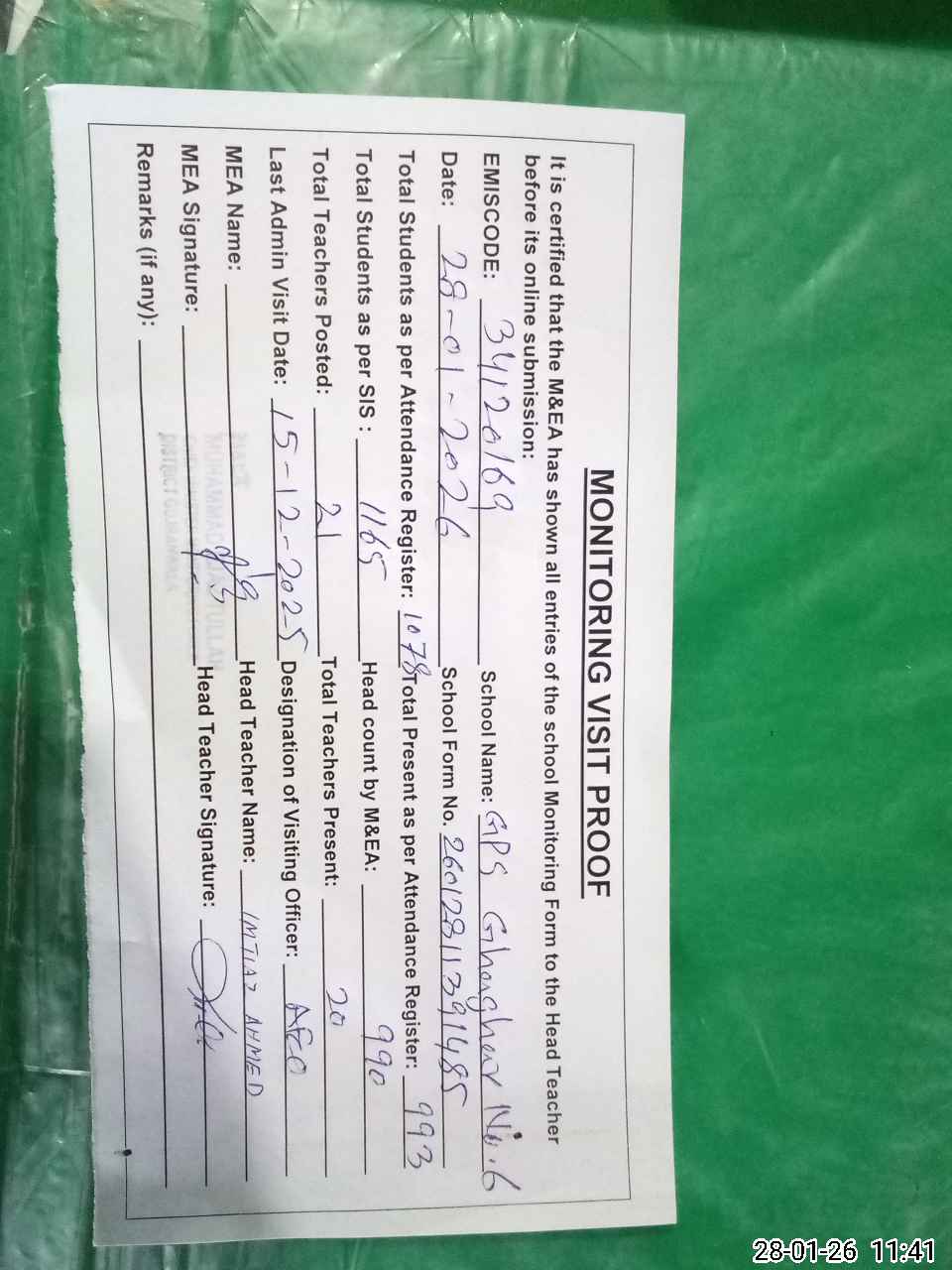 | Attendance Register | Head Teacher | MEA with School | Visit Proof |