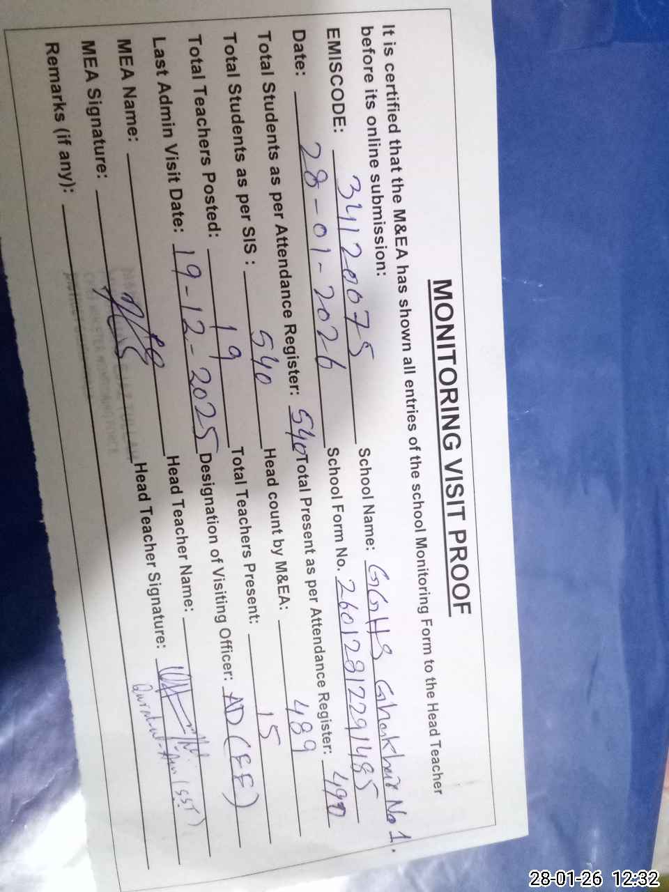 | Attendance Register | Head Teacher | MEA with School | Visit Proof |