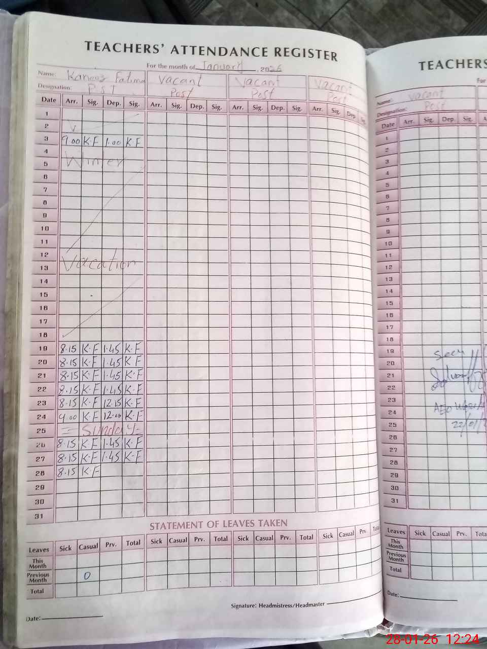 | Leave | Duty | Absent | Maternity | Medical | Ex- Pak |