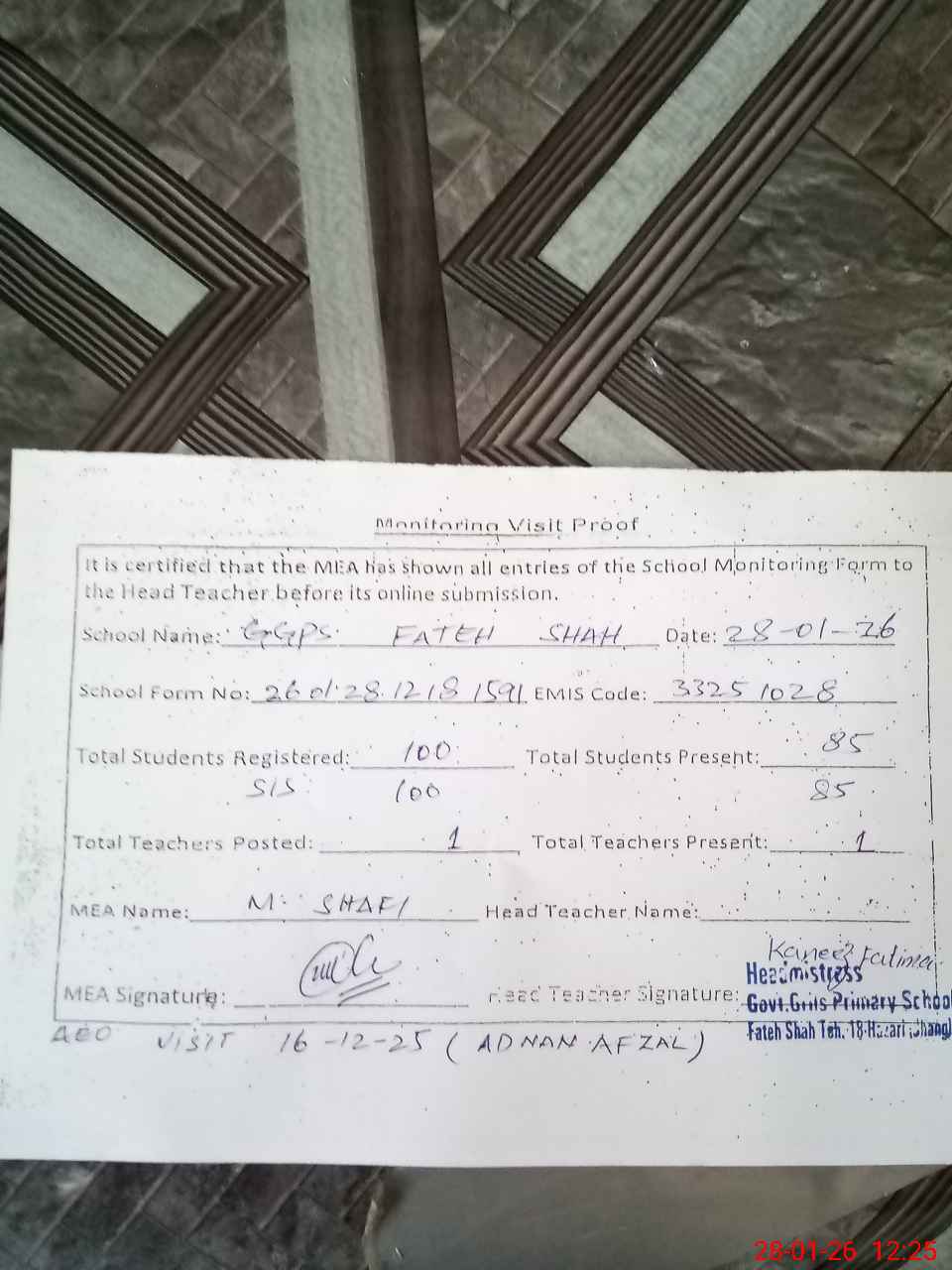| Attendance Register | Head Teacher | MEA with School | Visit Proof |