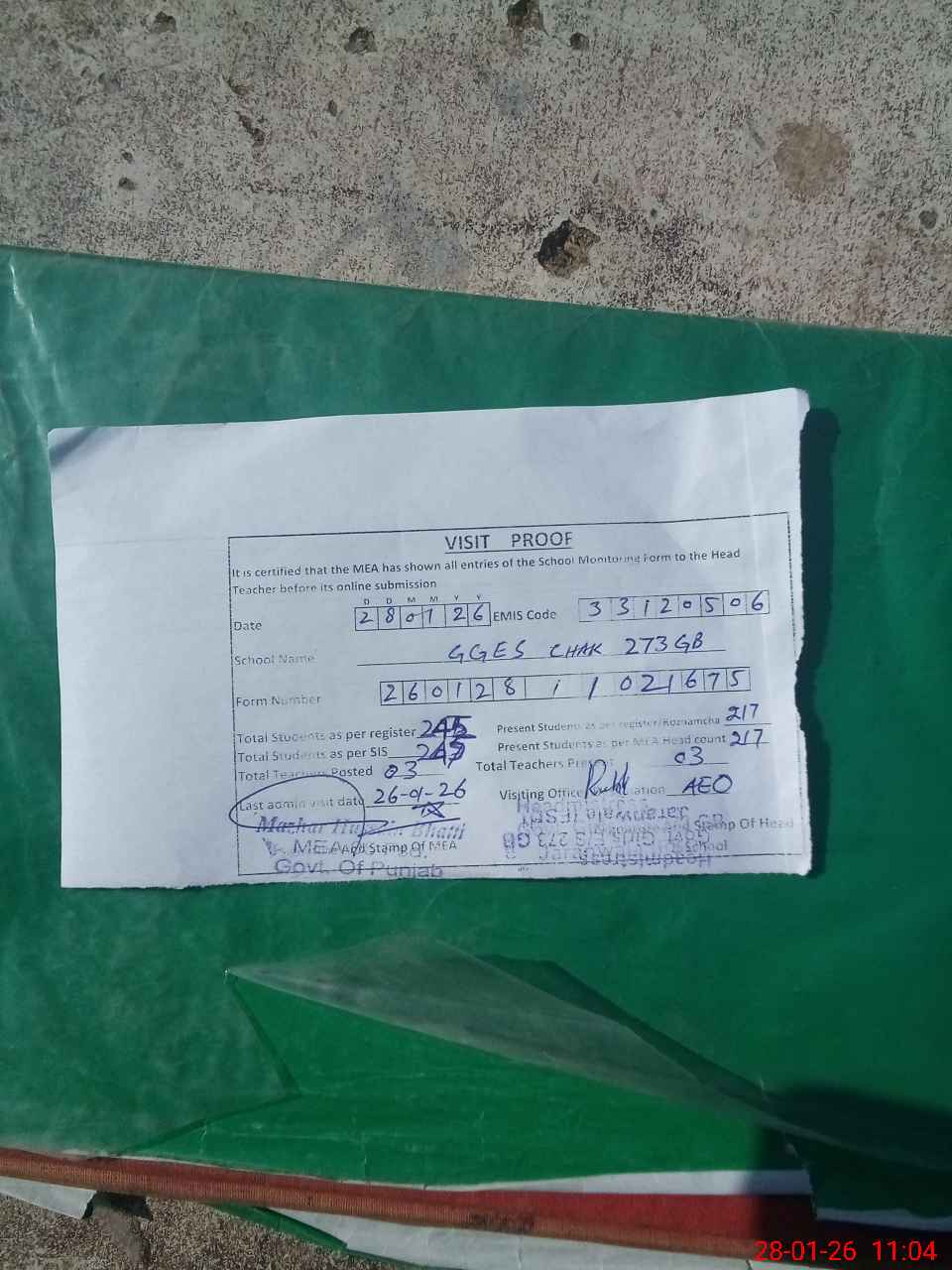 | Attendance Register | Head Teacher | MEA with School | Visit Proof |
