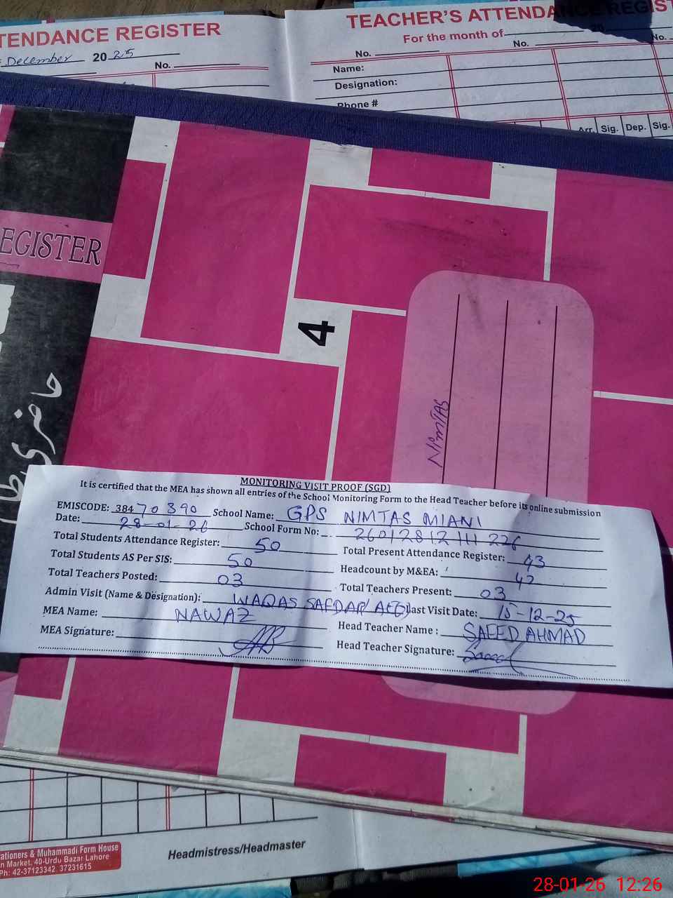 | Attendance Register | Head Teacher | MEA with School | Visit Proof |
