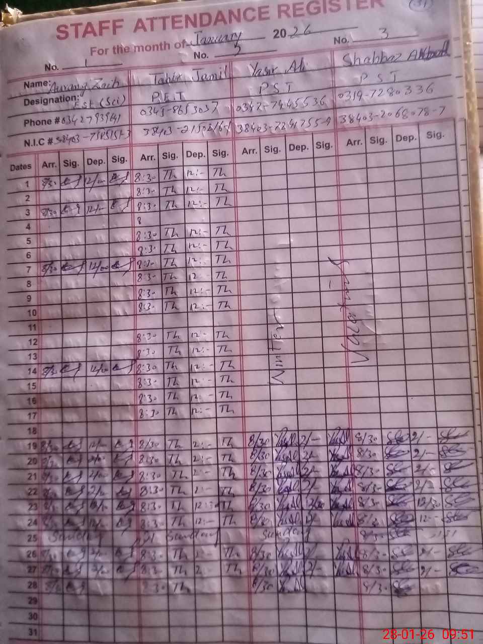 | CNIC | Full Name | Designation | R/C | Absence during last cal. month |
