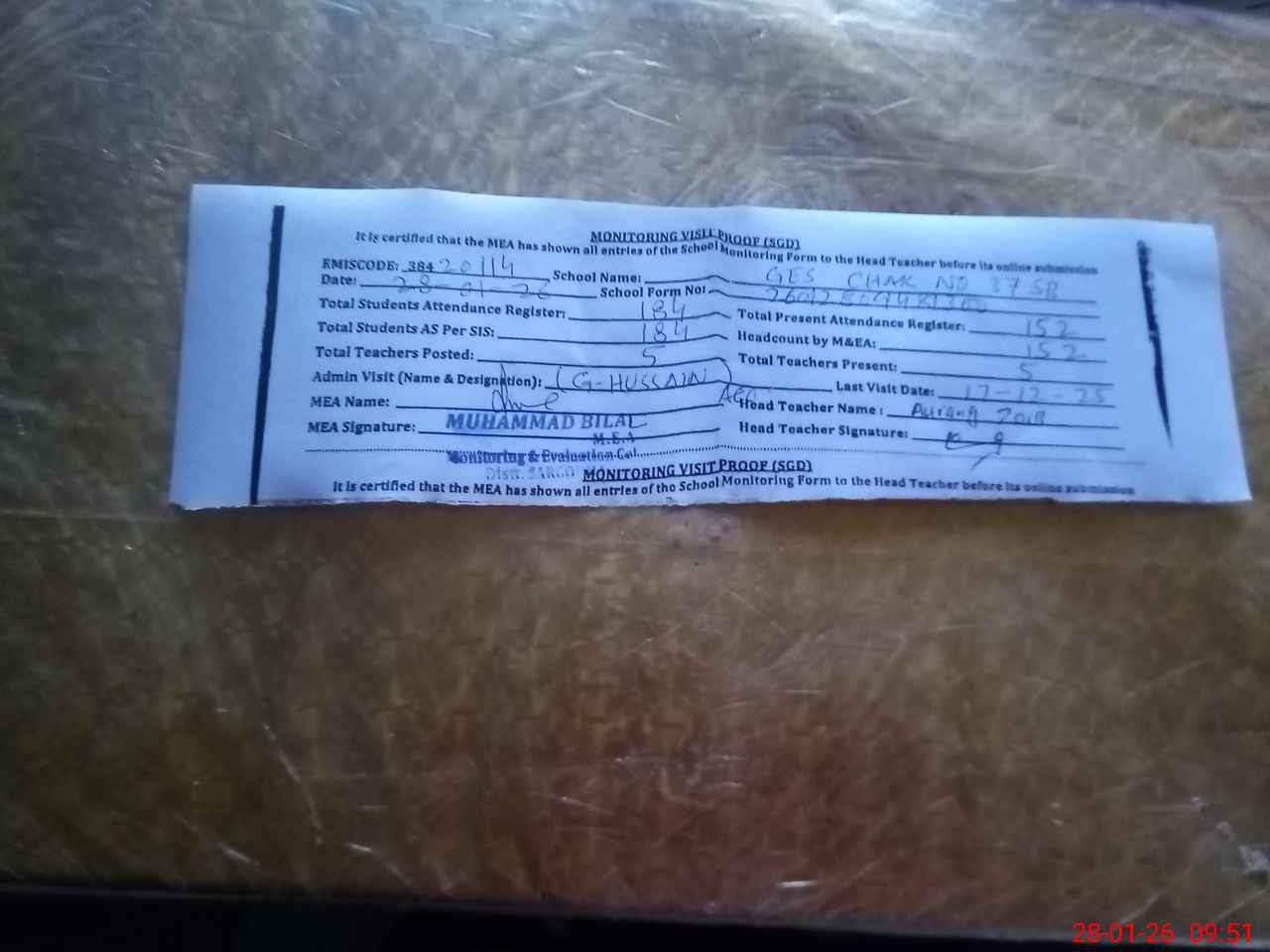 | Attendance Register | Head Teacher | MEA with School | Visit Proof |