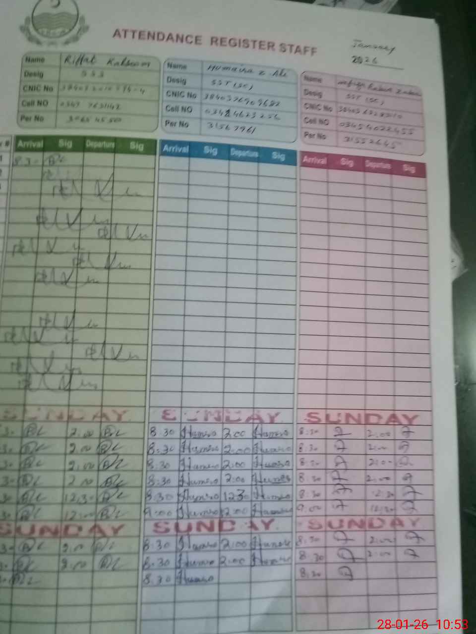 | CNIC | Full Name | Designation | R/C | Absence During Last Calender Month |