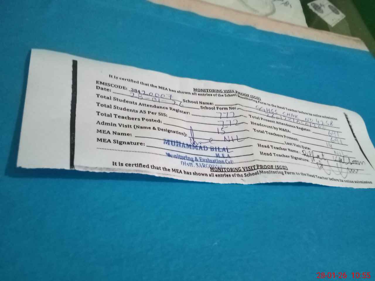 | Attendance Register | Head Teacher | MEA with School | Visit Proof |