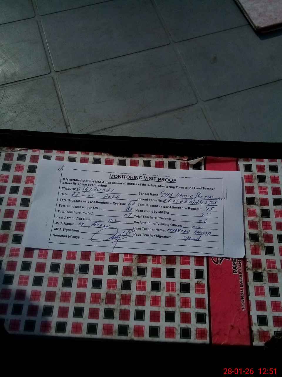 | Attendance Register | Head Teacher | MEA with School | Visit Proof |