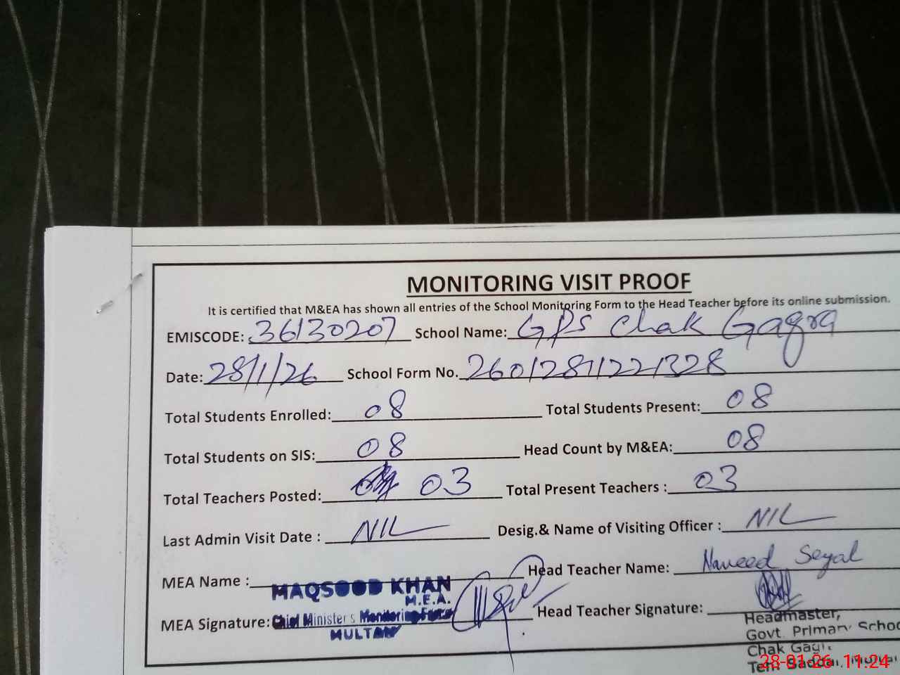 | Attendance Register | Head Teacher | MEA with School | Visit Proof |