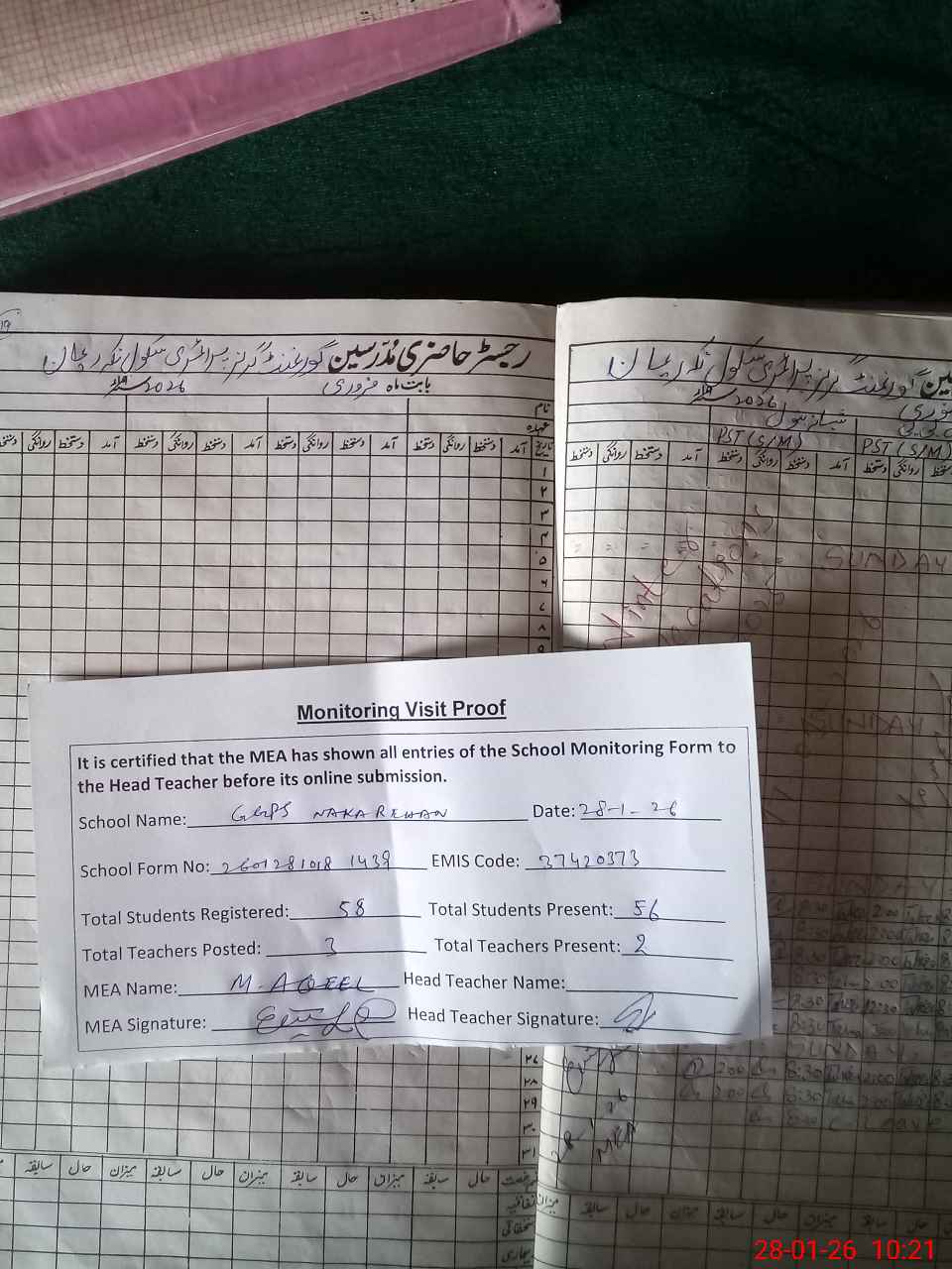 | Attendance Register | Head Teacher | MEA with School | Visit Proof |