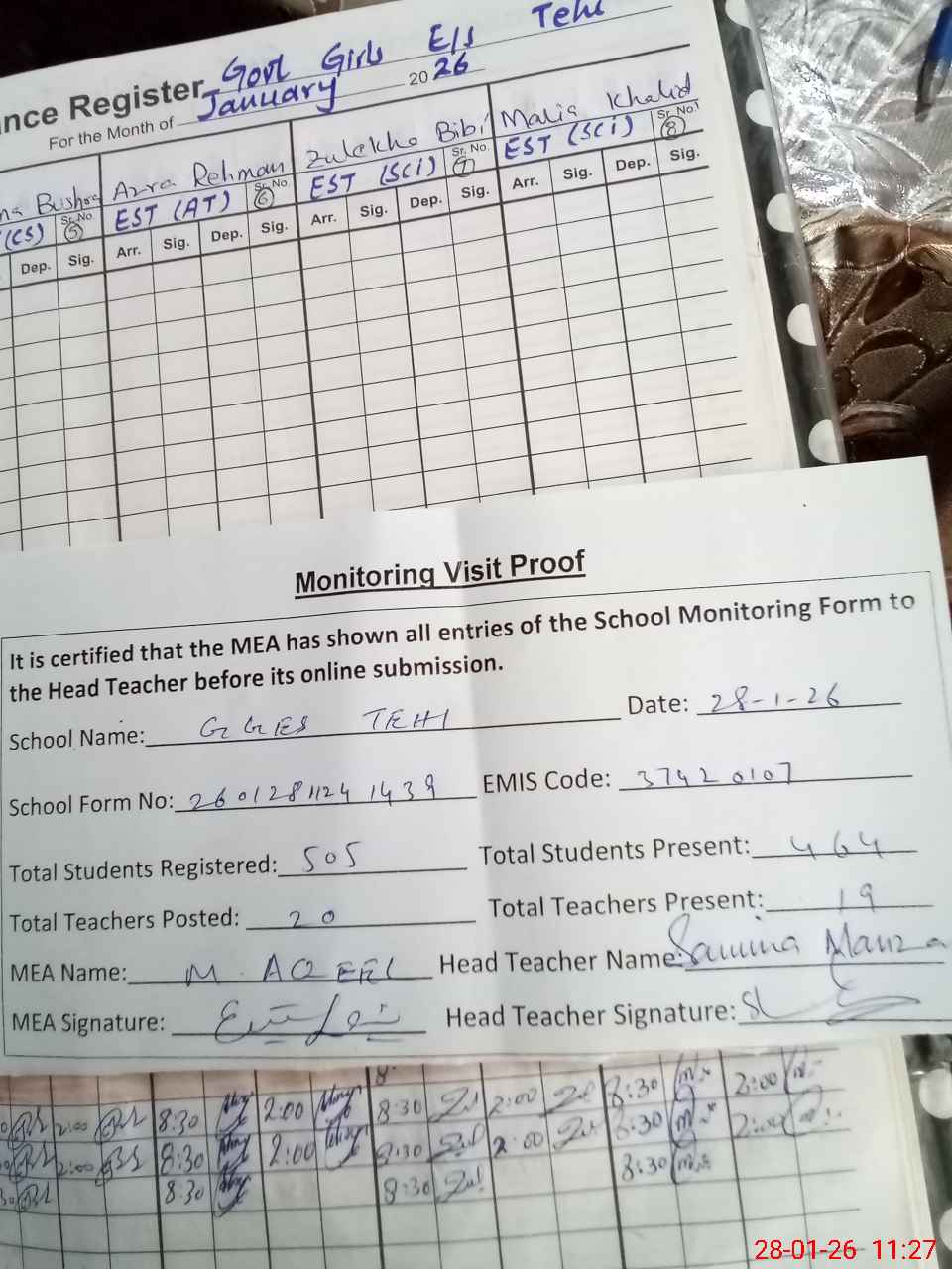 | Attendance Register | Head Teacher | MEA with School | Visit Proof |