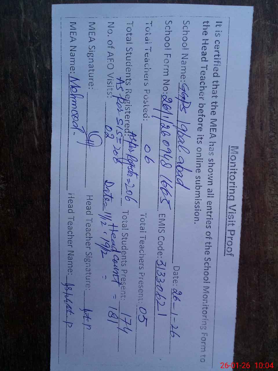 | Attendance Register | Head Teacher | MEA with School | Visit Proof |