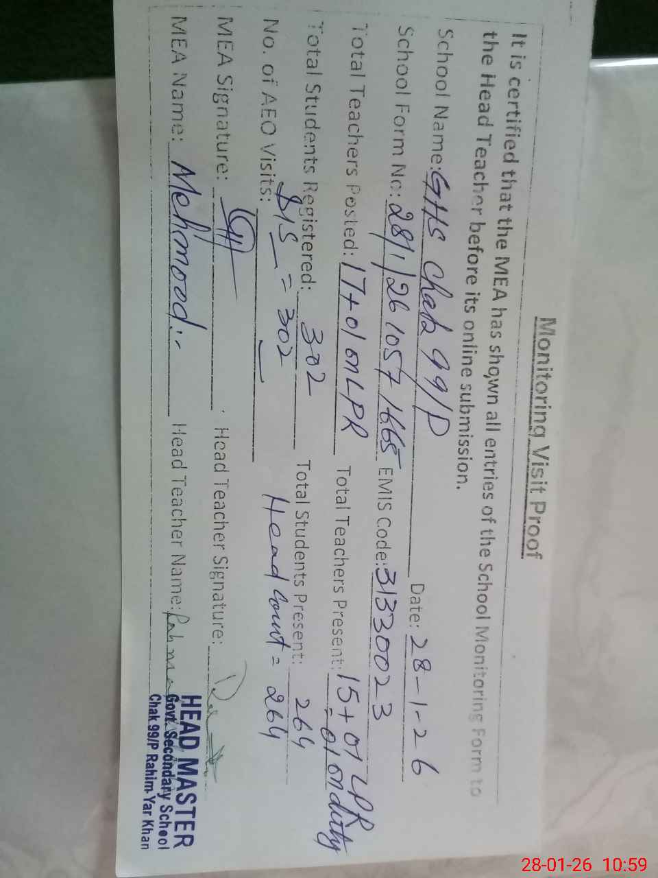 | EMIS Code: 31330023 | Name of School: GHS CHAK NO. 99/P | |||