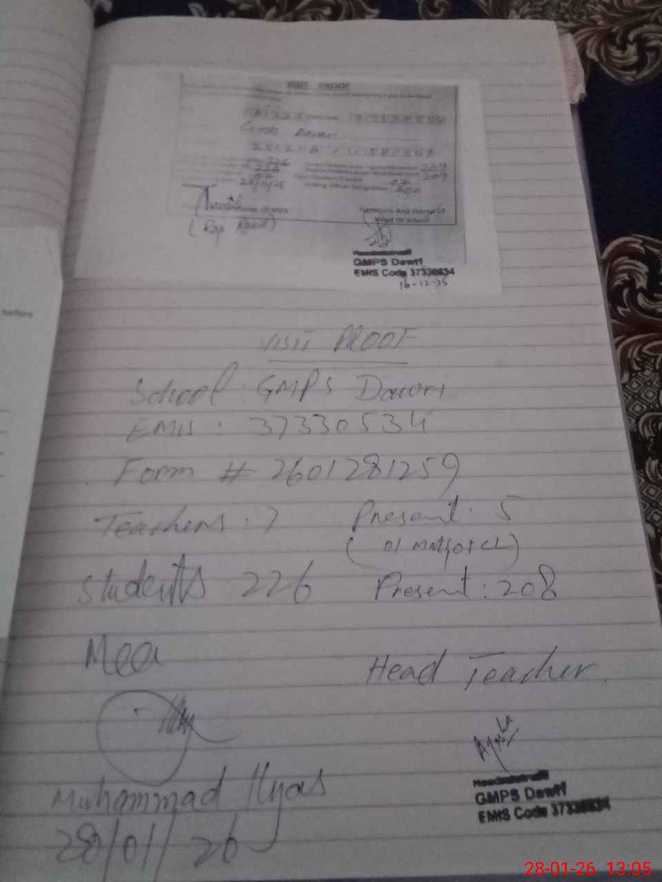 | Attendance Register | Head Teacher | MEA with School | Visit Proof |