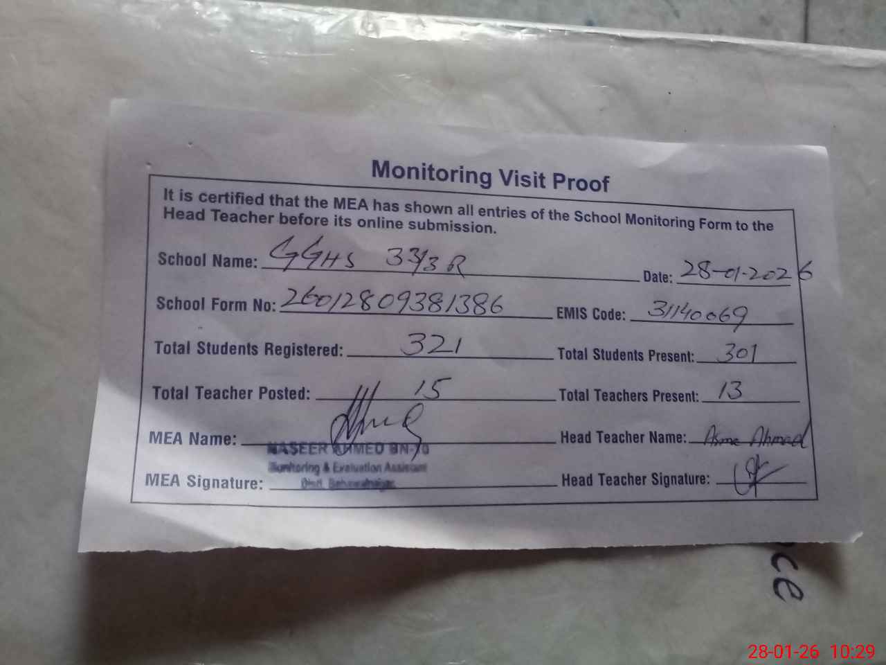 | Attendance Register | Head Teacher | MEA with School | Visit Proof |