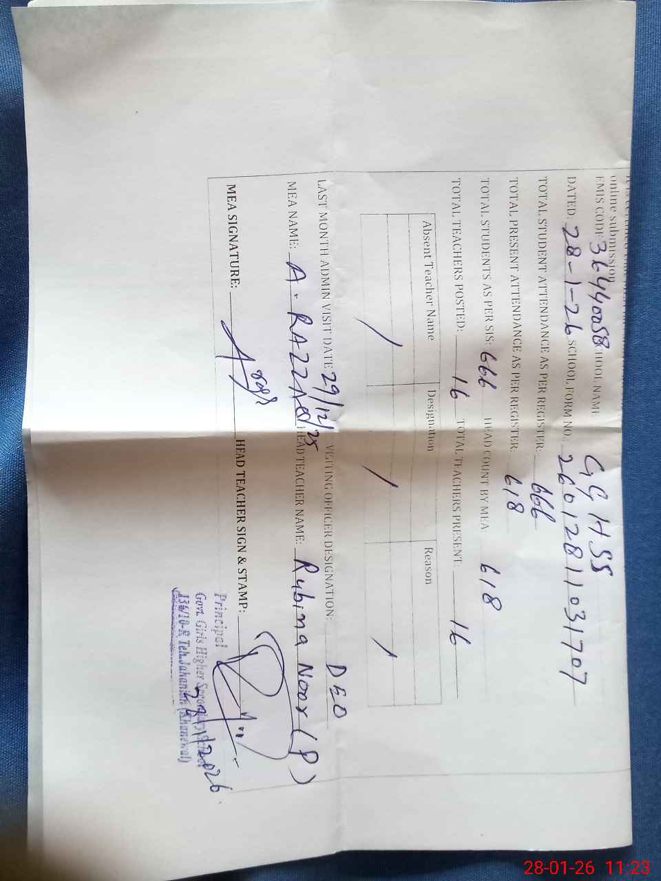 | Attendance Register | Head Teacher | MEA with School | Visit Proof |