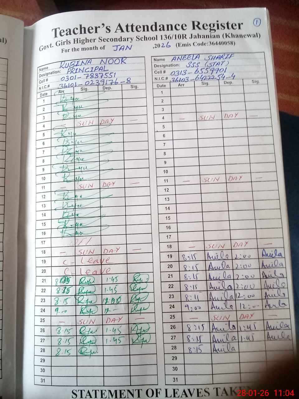 | CNIC | Full Name | Designation | R/C | Absence During Last Calender Month |