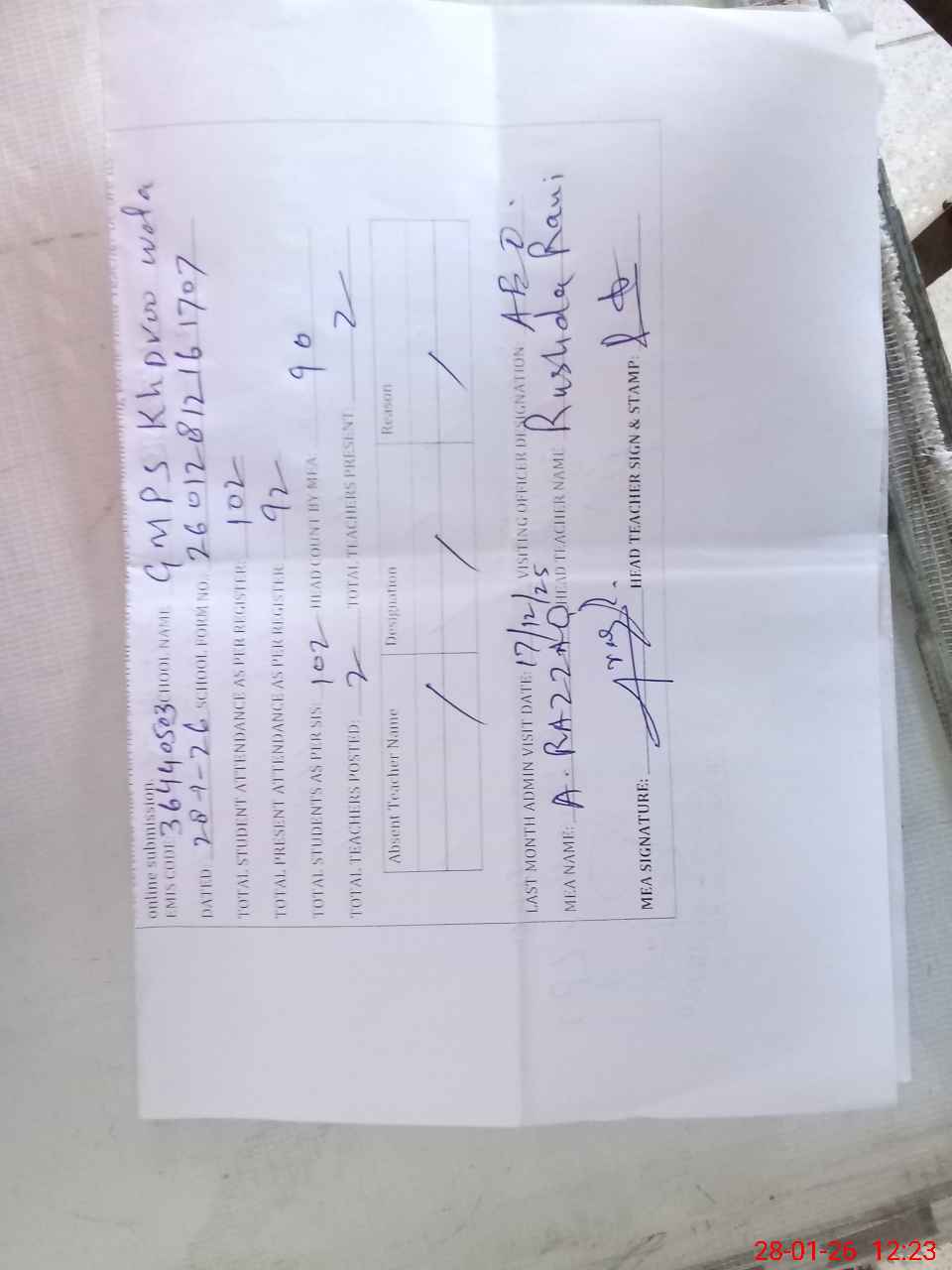| Attendance Register | Head Teacher | MEA with School | Visit Proof |
