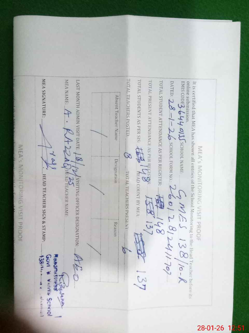 | Attendance Register | Head Teacher | MEA with School | Visit Proof |