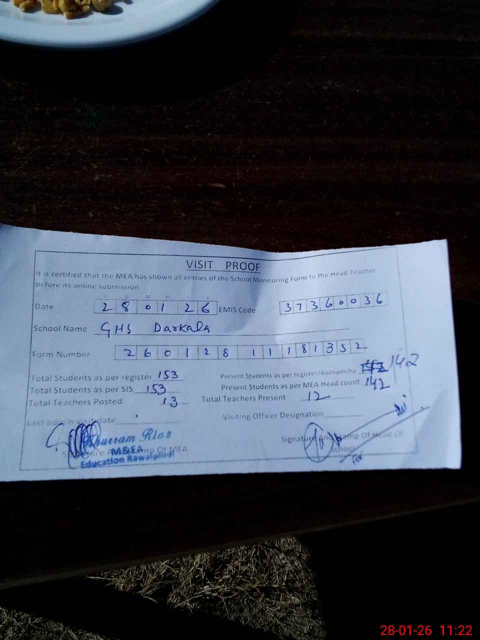 | Attendance Register | Head Teacher | MEA with School | Visit Proof |