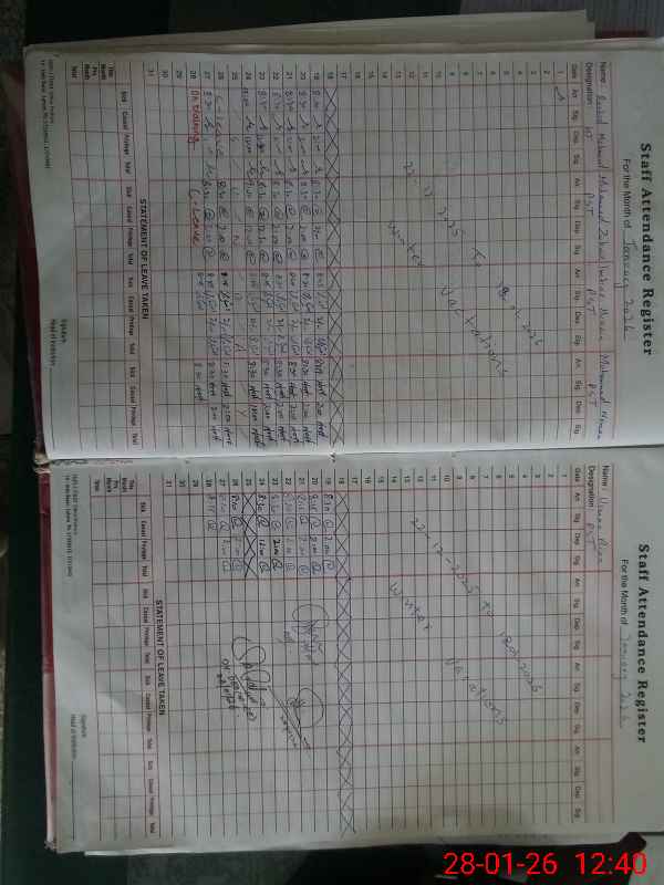 | CNIC | Full Name | Designation | R/C | Absence During Last Calender Month |