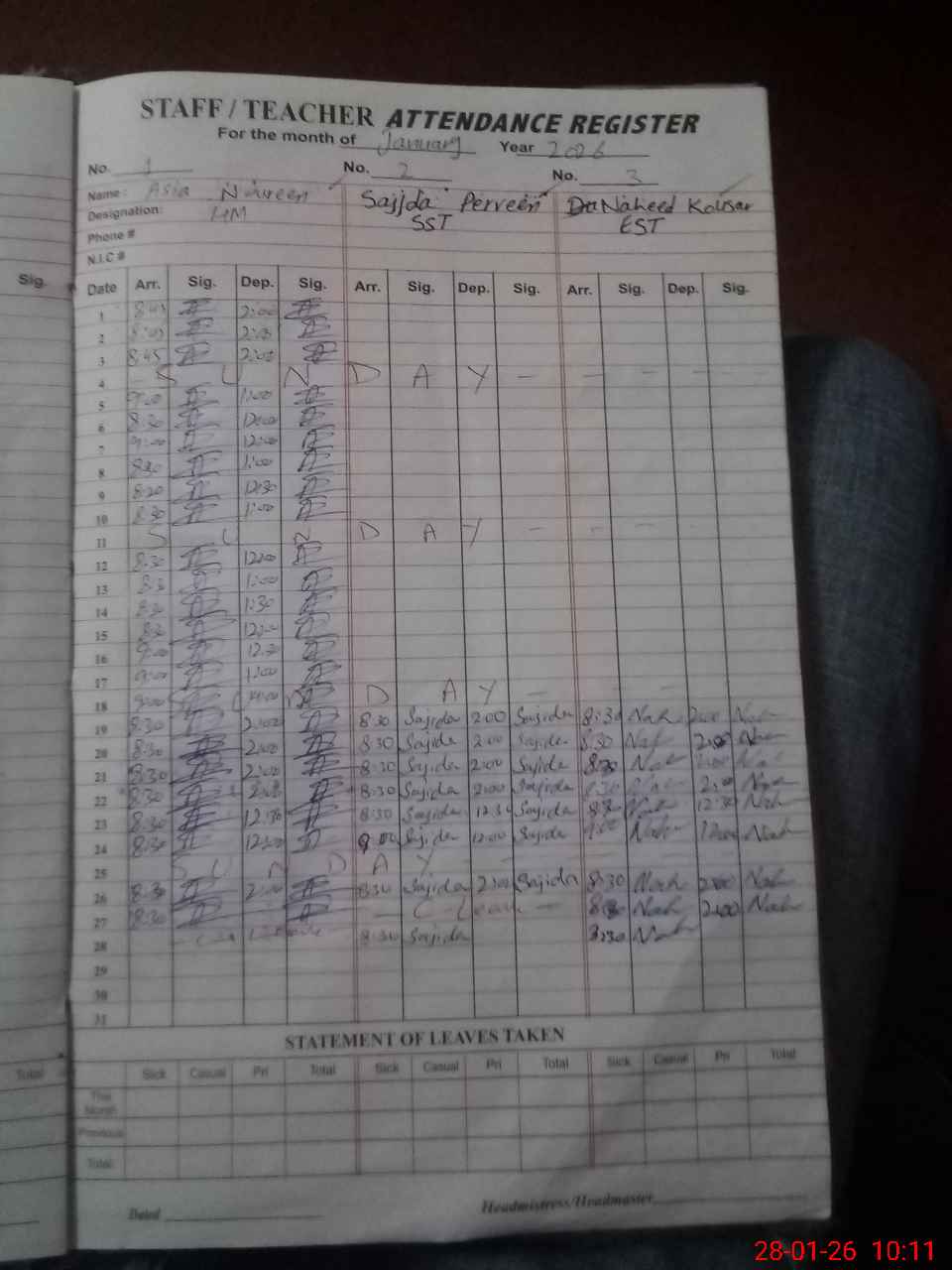 | Remarks (Use Separate Page if Required): JC ADEEL ATTENDANCE MARKED BUT SHE IS NOT AVAILABLE IN SCHOOL NOR ANY MOVEMENT RECORD AVAILABLE SO MARKED ABSENT SOME STUDENTS NAME HELD IN STUDENTS ATTENDENCE LIST NOT AVAILABLE ON STUDENTS ATTENDENCE REGISTERS | |||||