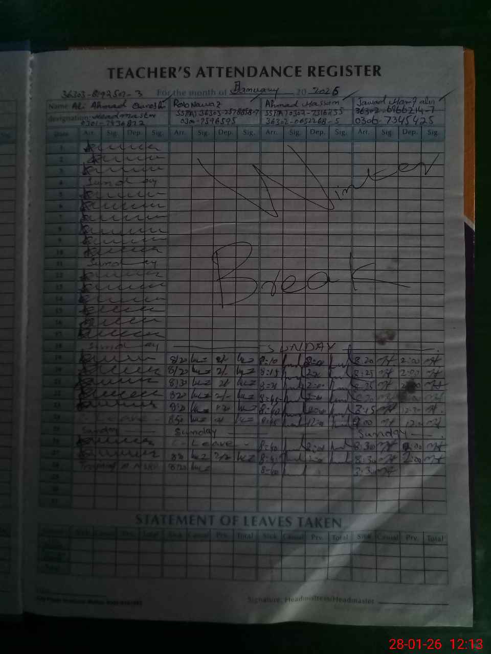 | Name: Al**** Ah**** Qu**** Designation: (School Headmaster's/Headmistress's) HEADMASTER Phone/Cell Number: 03**** |