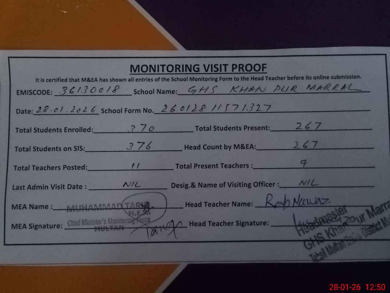 | EMIS Code: 36130018 | Name of School: GHS KHAN PUR MARAL VIA MAKHDOOM RASHID MULTAN | |||