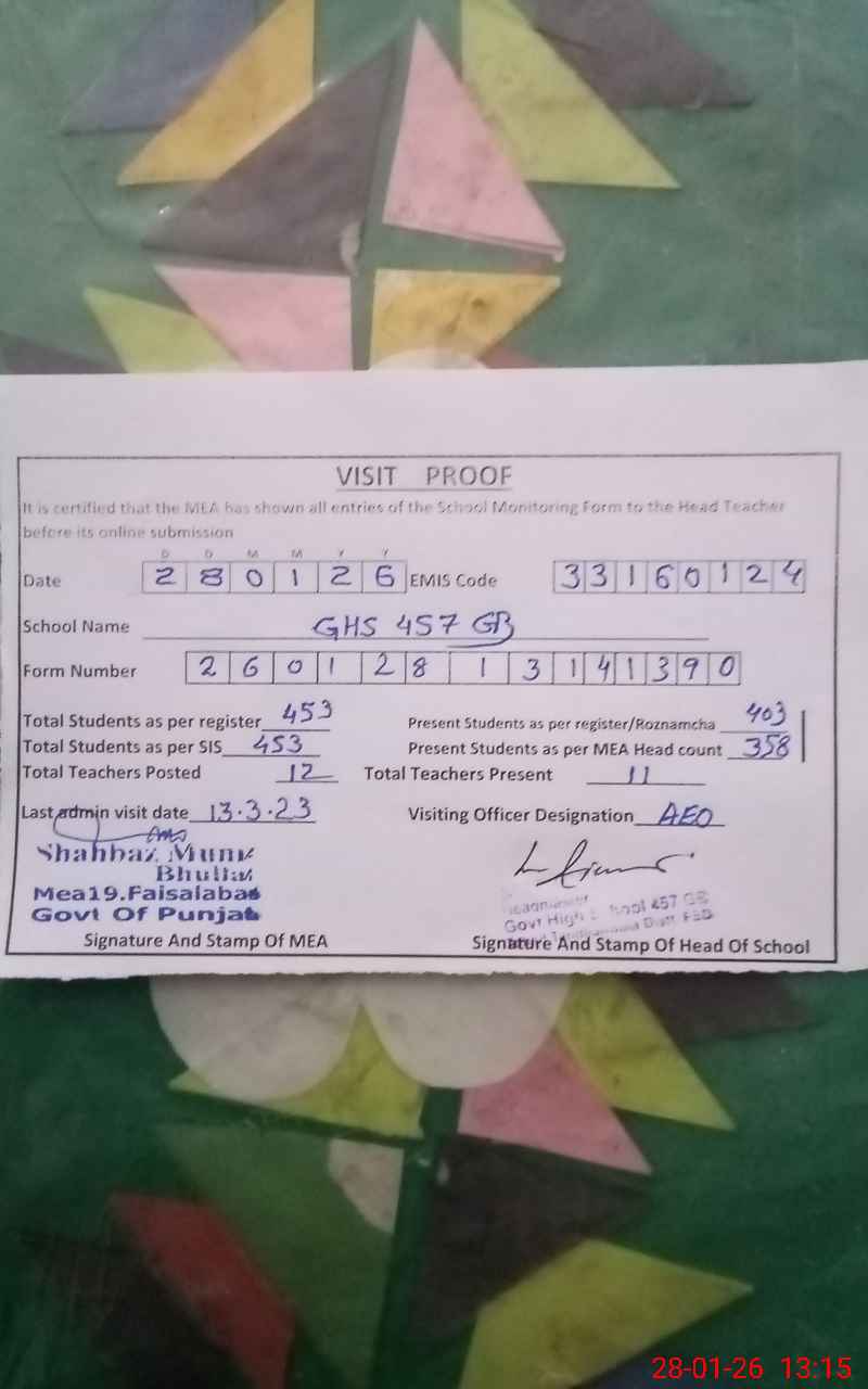 | EMIS Code: 33160124 | Name of School: GHS CHAK 457 GB I TANDLIANWALA | |||